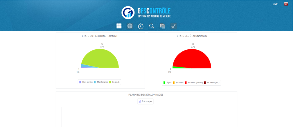 GesContrôle est un logiciel de gestion des moyens de mesure (GMM), très simple d’utilisation, dédié à la gestion de votre parc d’instruments. Il vous permet bien sûr de gérer toutes les caractéristiques de vos instruments, les affectations pour chaque poste de votre atelier, mais il est également un logiciel indispensable dans la métrologie pour la gestion des périodicités d’étalonnage et des opérations sur vos instruments.